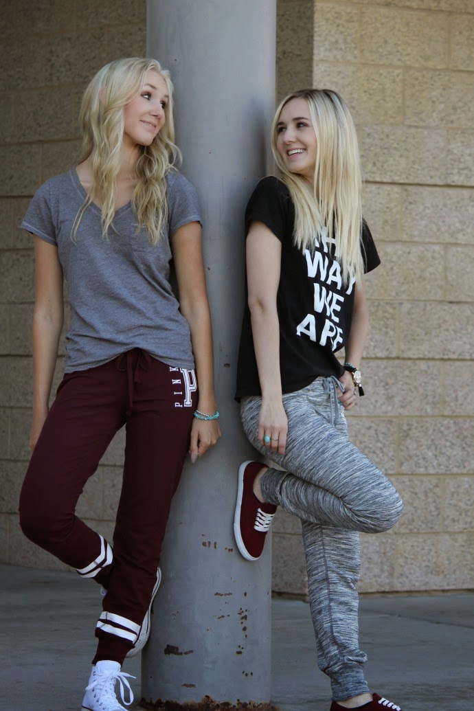 I love hanging out with my sister, and we get told quite often how we either look alike or act alike. when we were younger we’d always wear similar outfits, and now as we’re older we still have similar taste. we really love VS Pink sweats and when the Gym Pant came out we were thrilled! the fit is so cute, and the colors are amazing, we also love the cobalt blue and olive green ones π