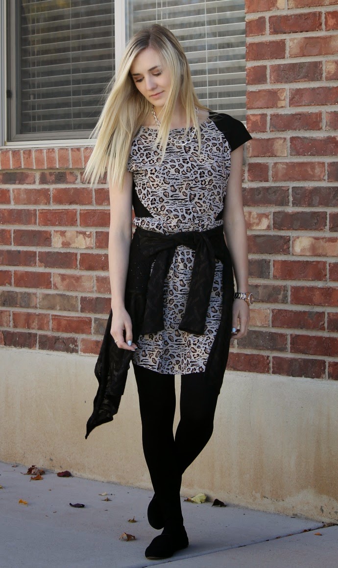 Dora Landa dress c/o // black cardigan, Buckle (old) // thick tights, Rue 21 (old) // Fossil watch // Grace Adele necklace (no longer available) // J.Crew Factory loafers