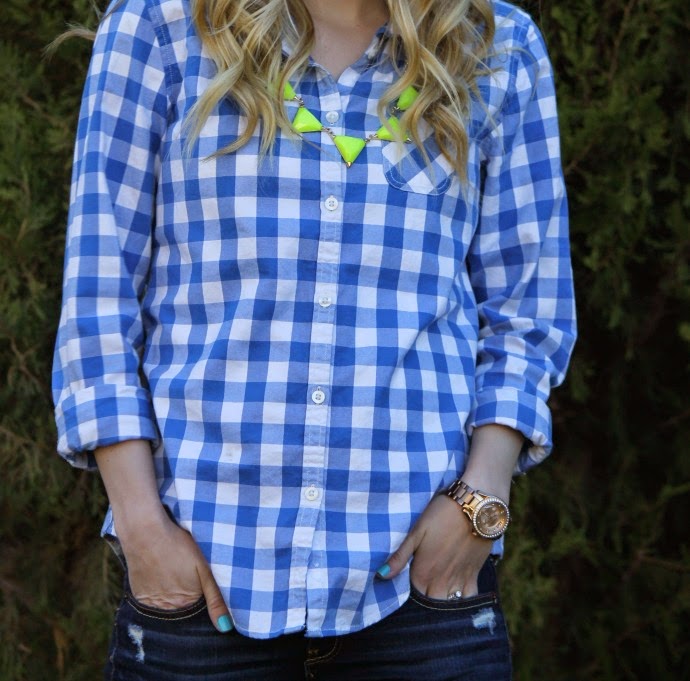 this necklace I got last week in my Rocksbox ( a subscription jewelry delivery / borrowing service .. super cool! ) check out my full post on my first experience here π .. with the necklace being this bold π I honestly didn’t have a hard time styling it. I knew it’d make the best pop against neutrals or my shirt that I happened to be wearing that day! yellow and blue just GO together!! and where I don’t ever wear this shade of yellow in a shirt, I thought a necklace was a great approach to incorporating this neon shade into my life without really accentuating my fair skin π
