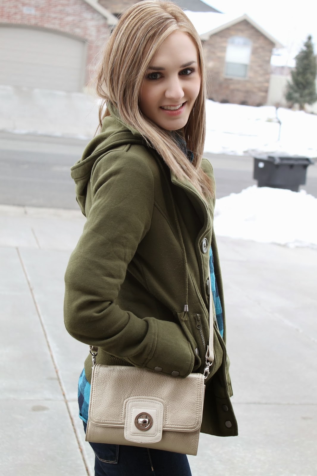 coat | jeans | check top similar | booties | earrings | clutch