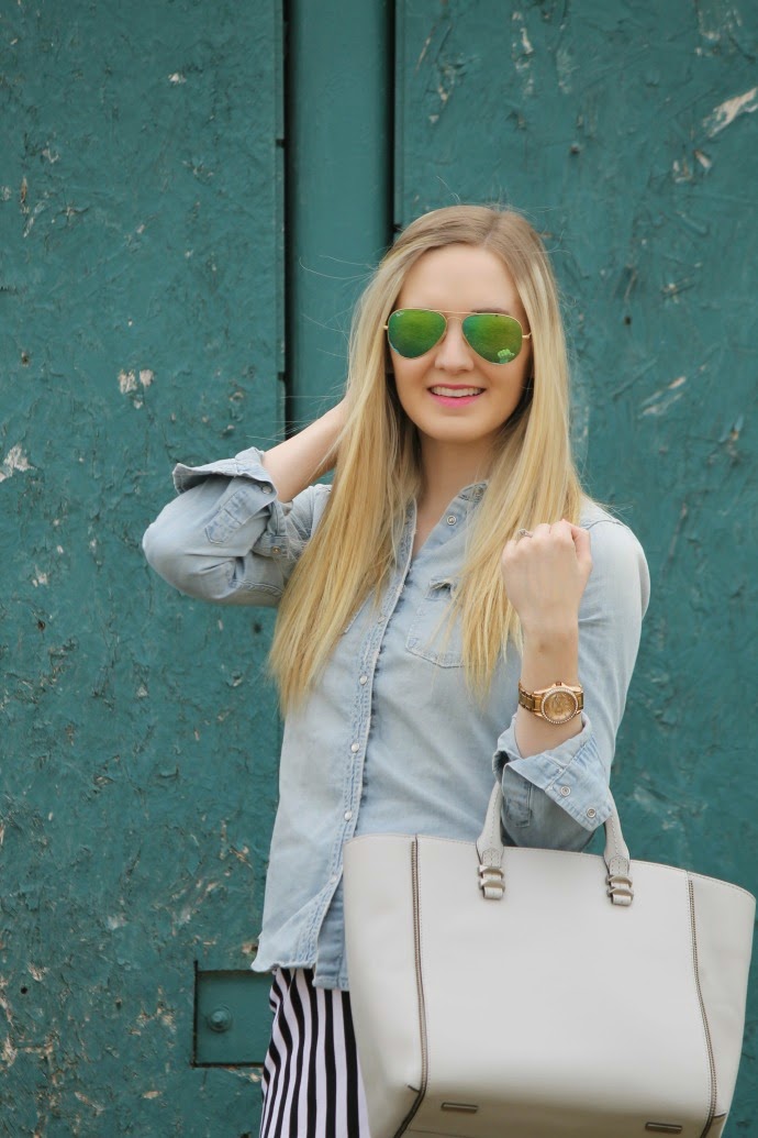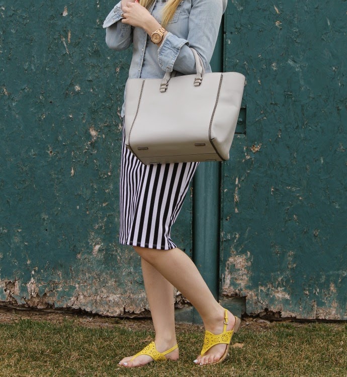 LuLaRoe skirt // Payless sandals, last year, I linked below a few yellow shoes I’m loving // Hollister chambray top, old // Rebecca Minkoff bag, love this shade for spring // Ray Ban sunglasses // Fossil watch // Maybelline lipstick, shade is ‘ carnation cabernet’ (loving this formula)