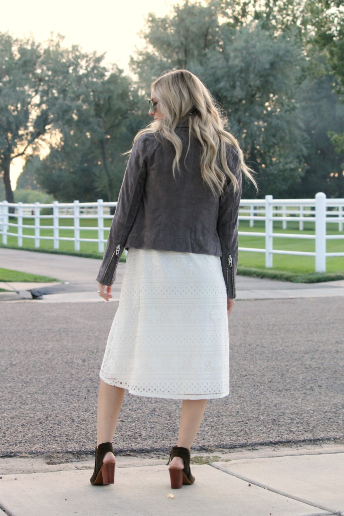 I’m wearing a gray suede jacket and green suede booties, suede is instantly going to take a summer dress into more of a fall feel. heavier fabrics and rich textures bring in the coziness that you’d expect with a fall outfit. (I’m loving this pair and this pair of booties)
