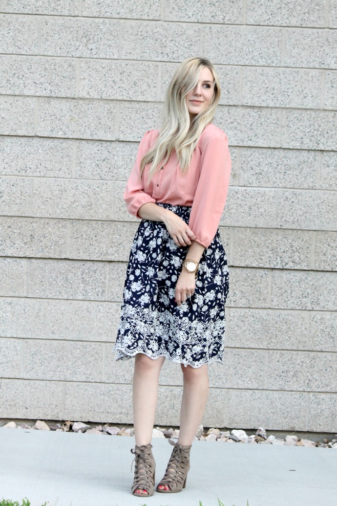 today’s look I wore to church this past Sunday and it was comfortable enough to chase my active little girl around in, but I still felt so stylish and on trend! this beautiful coral/pink blouse has the prettiest sleeve and neckline details – I know this top will be a staple in my wardrobe for any season. You guys all know me and my love for floral prints πŸ˜‰ and this skirt is no exception, it truly is one of my favorite things in my closet right now! and how fabulous that it fits right over my baby bump πŸ˜‰ I love being able to wear things for maternity wear that aren’t necessarily labeled that way.